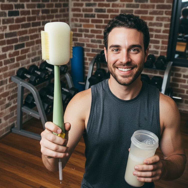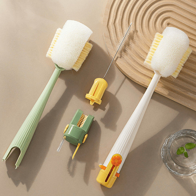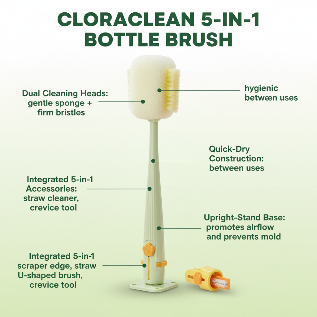• Dual cleaning heads for gentle & tough scrubbing • Built-in scraper & straw/crevice brush • Fits most bottles, cups, and more